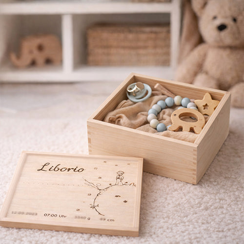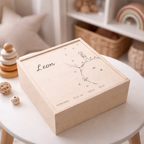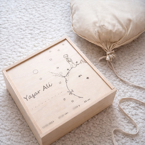 Die Box wird personalisiert mit dem Motiv Kleiner Prinz sowie den Geburtsdaten deines Babys und wird so zu einem ganz persönlichen Andenken, das ein Leben lang bleibt. Hochwertig verarbeitet und zeitlos im Design begleitet sie euch durch viele Jahre und bewahrt die schönsten Momente sicher auf.