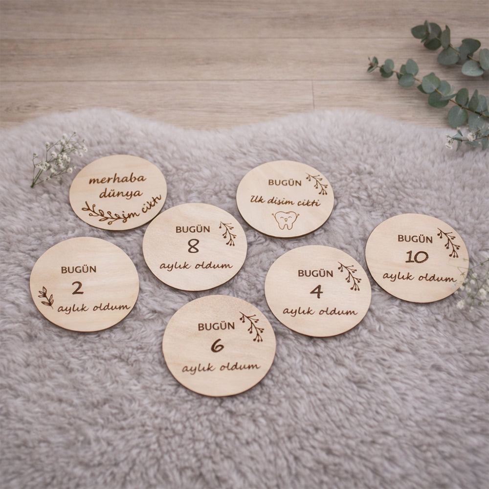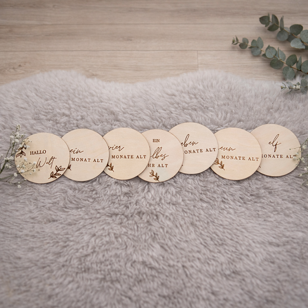 Das Set besteht aus 6 doppelseitig gravierten Karten – so entstehen insgesamt 12 Monats-Meilensteine, die du perfekt in eure Erinnerungsfotos integrieren kannst.