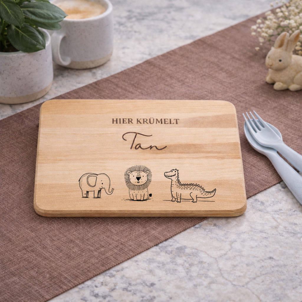 Unser personalisiertes Frühstücksbrett mit liebevollen Motiven macht jede Mahlzeit zu einem kleinen Abenteuer.