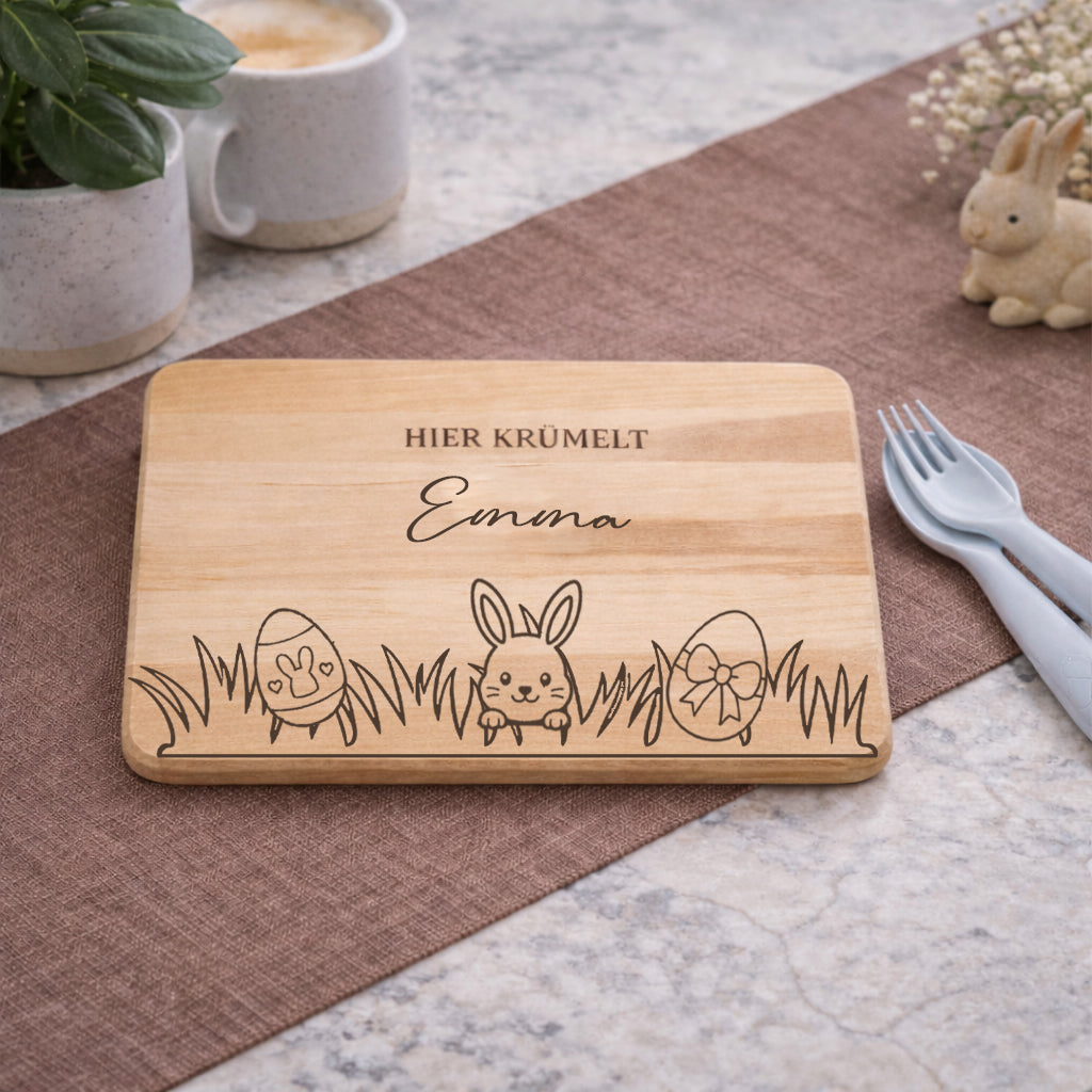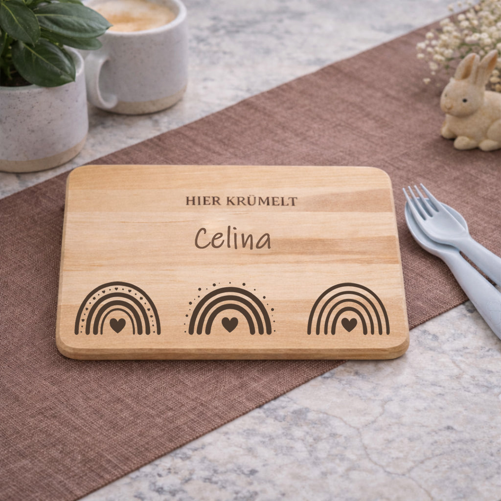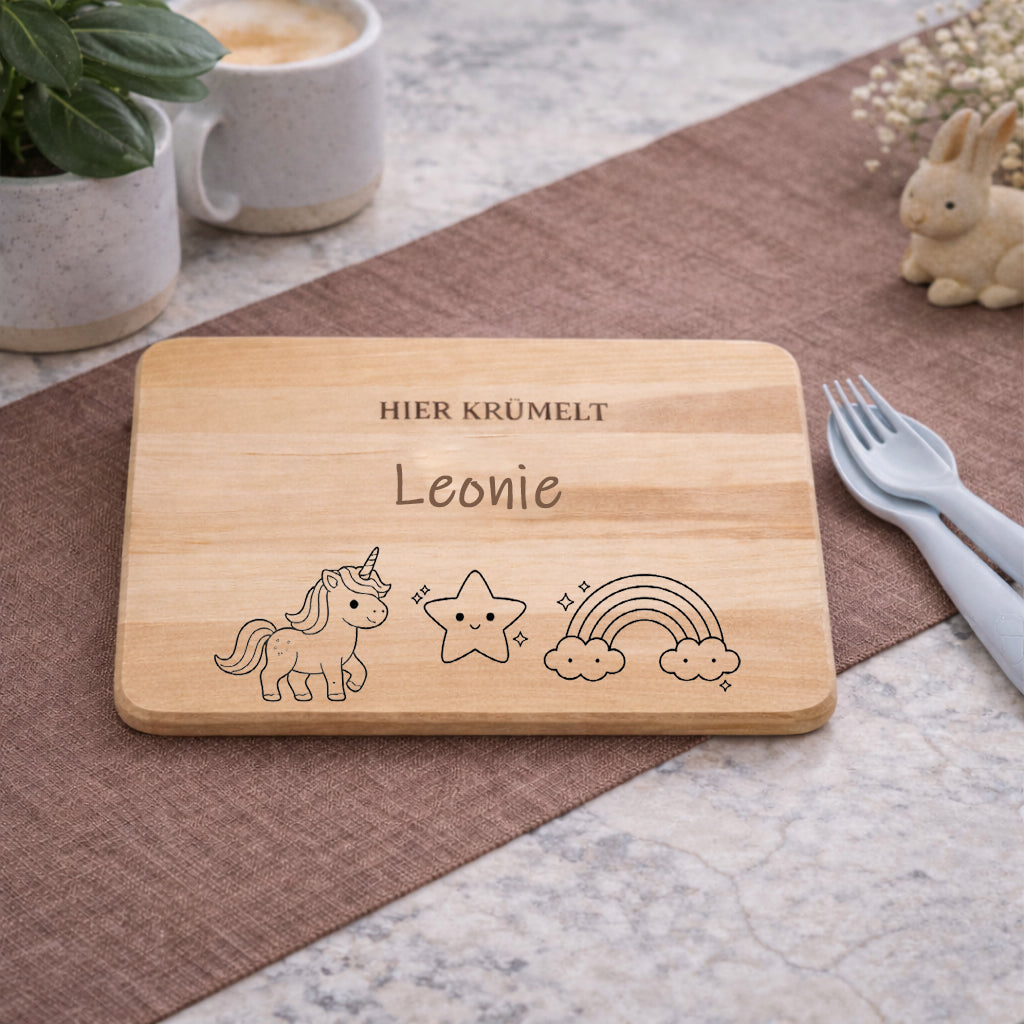 Durch die individuelle Namensgravur wird jedes Brett zu einem ganz besonderen Unikat – ein persönlicher Lieblingsplatz für kleine Krümelmonster.